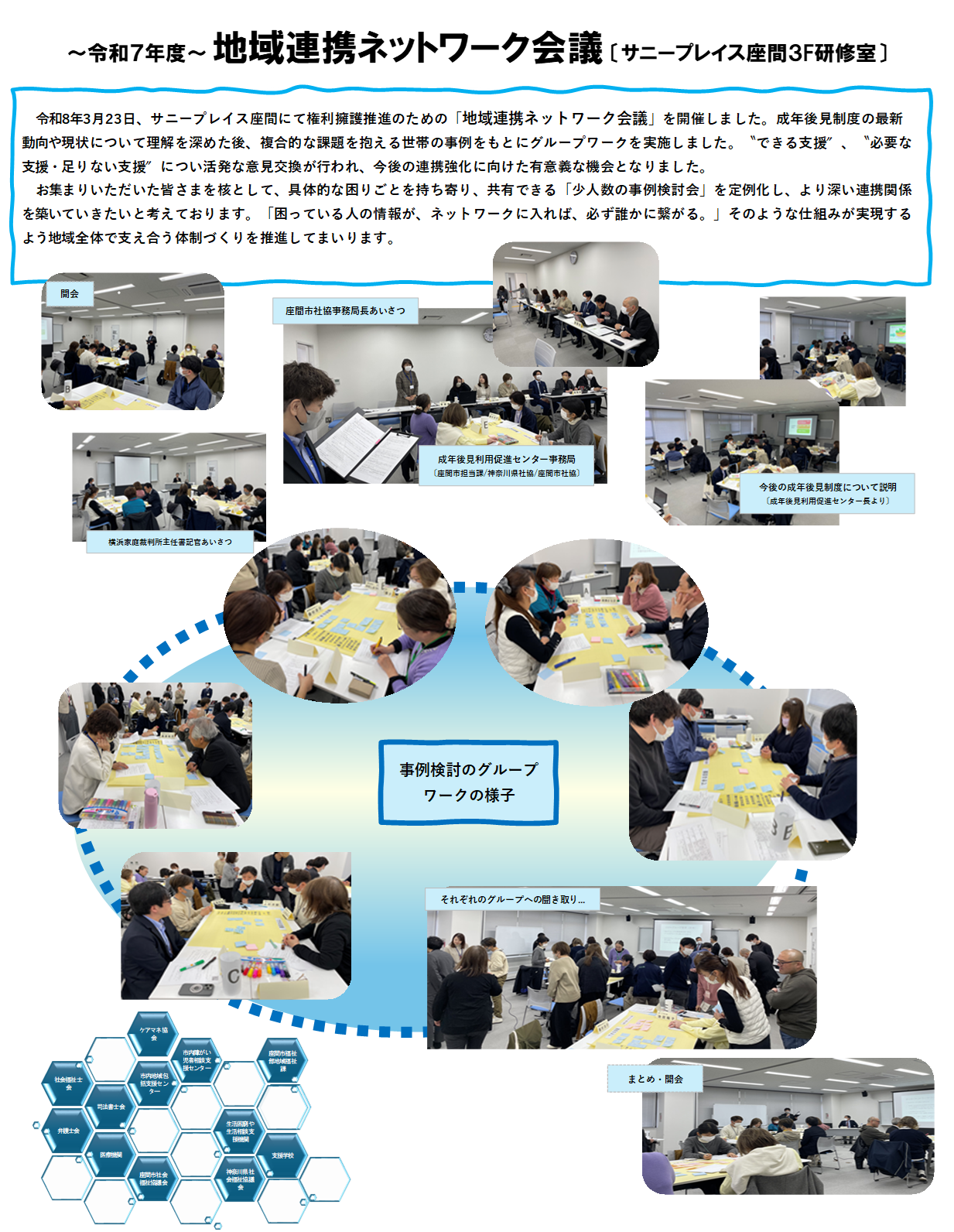 (構成団体:神奈川県弁護士会、(公社)成年後見センター・リーガルサポート神奈川県支部、(公社)コスモス成年後見サポートセンター神奈川県支部、(公社)神奈川県社会福祉士会、東京地方税理士会、法人後見実施団体、座間市高齢・障がい担当課)